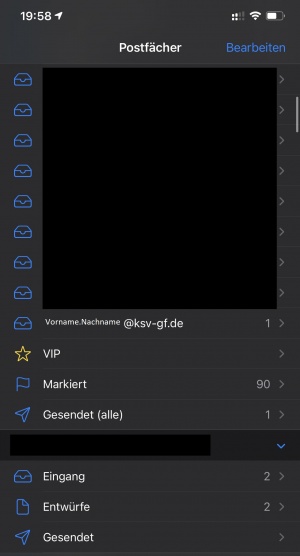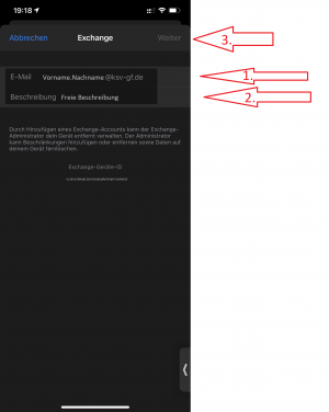 Zuerst Trage im ersten feld nun bitte deine E-Mailaddresse ein und vergebe um zweiten Feld eine freie Beschreibung, unter der du den Account später in deiner Mail App wirderfinden möchtest. Hier bietet sich "KSV GF" an. Nachdem du beide felder ausgefüllt hast klicke oben rechts auf "Weiter".